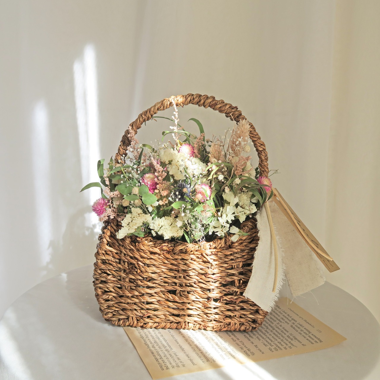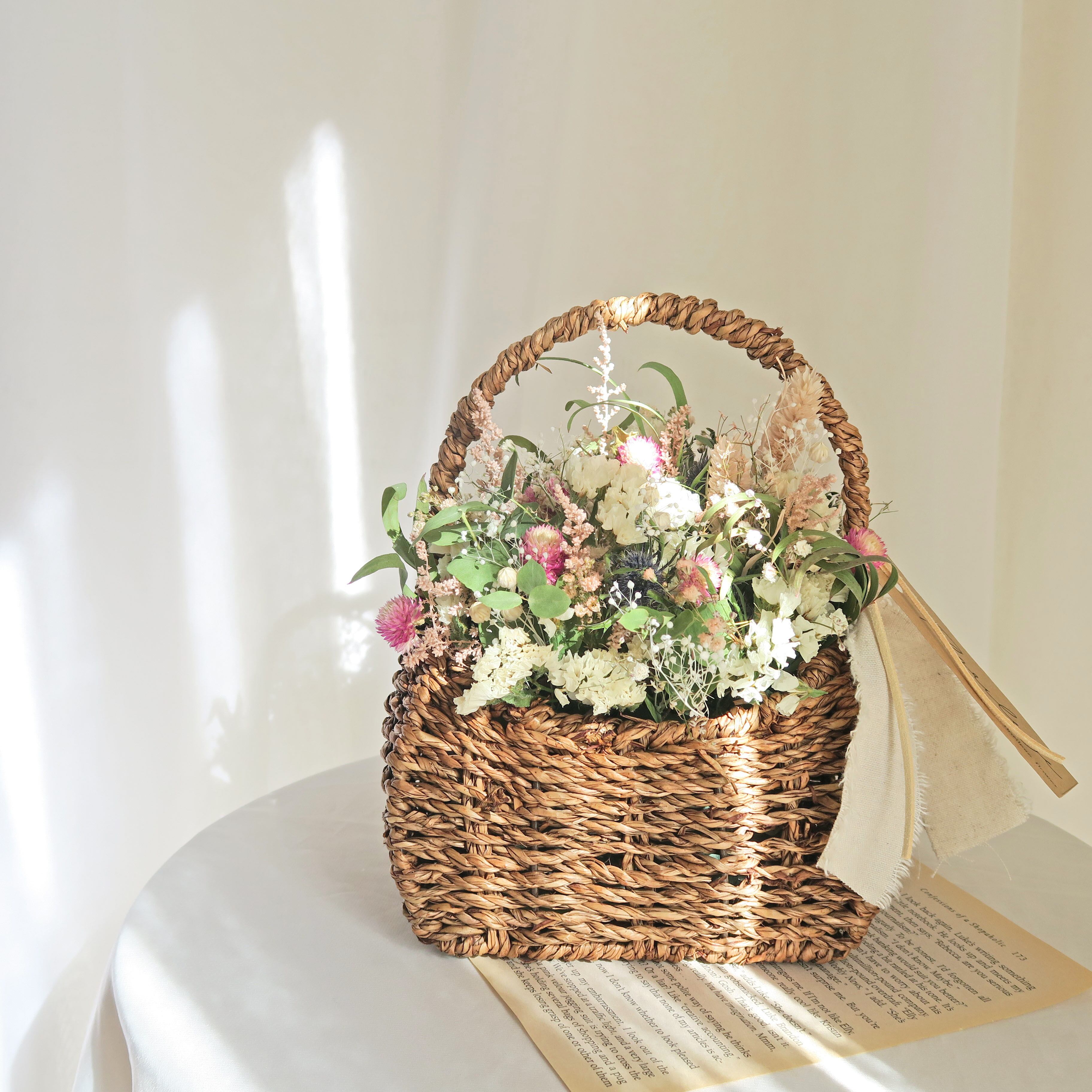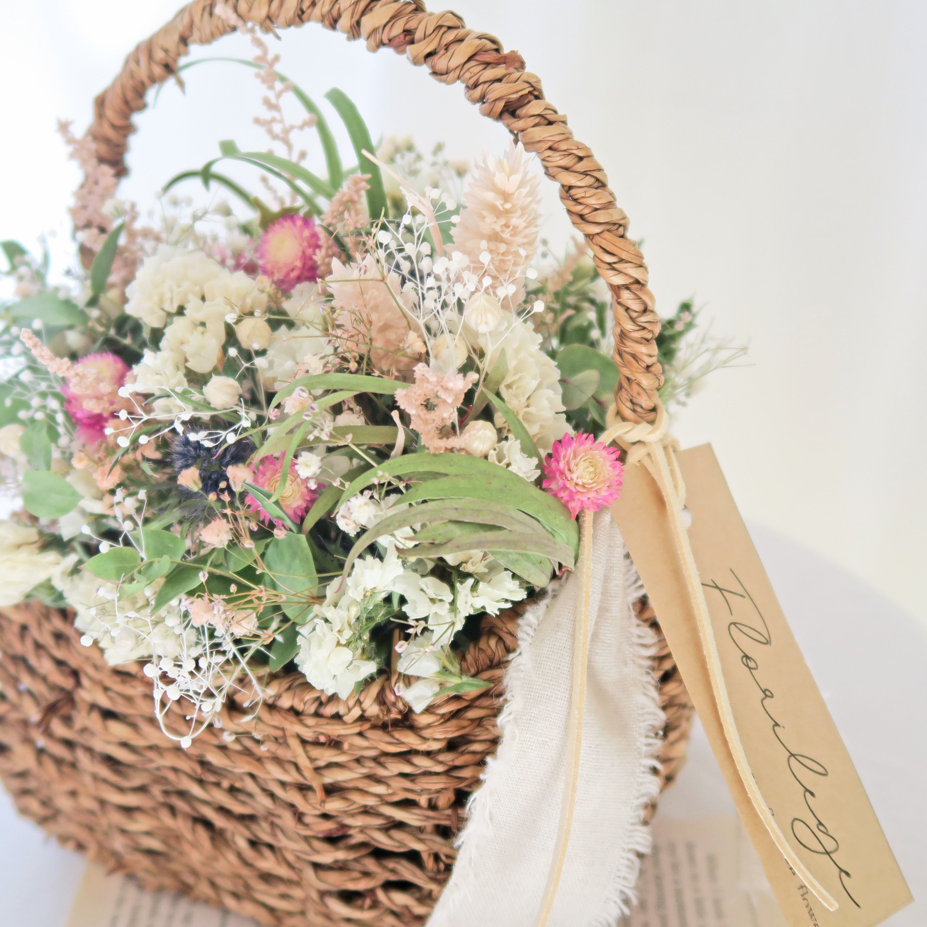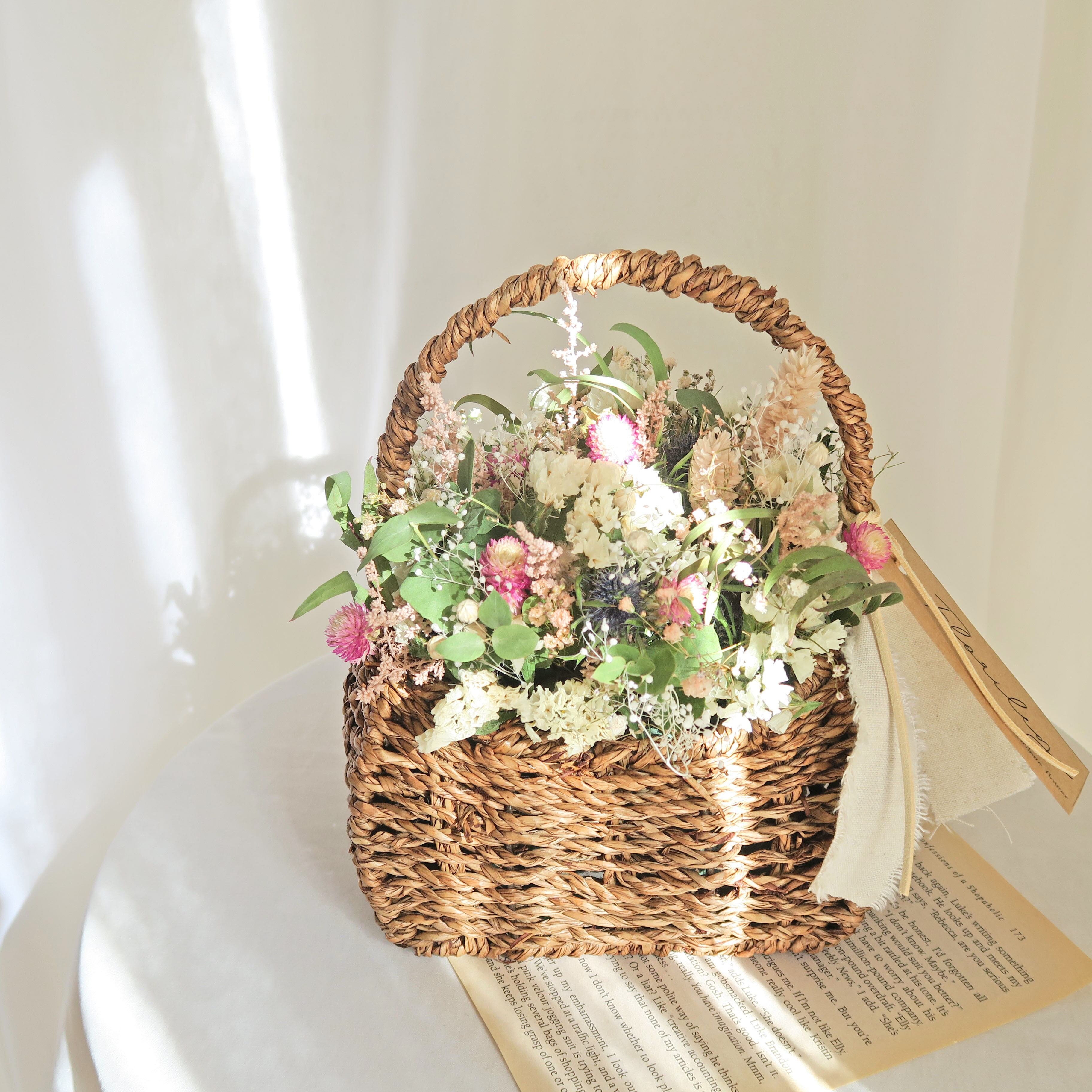 淡く優しい雰囲気のドライフラワーバスケットです。