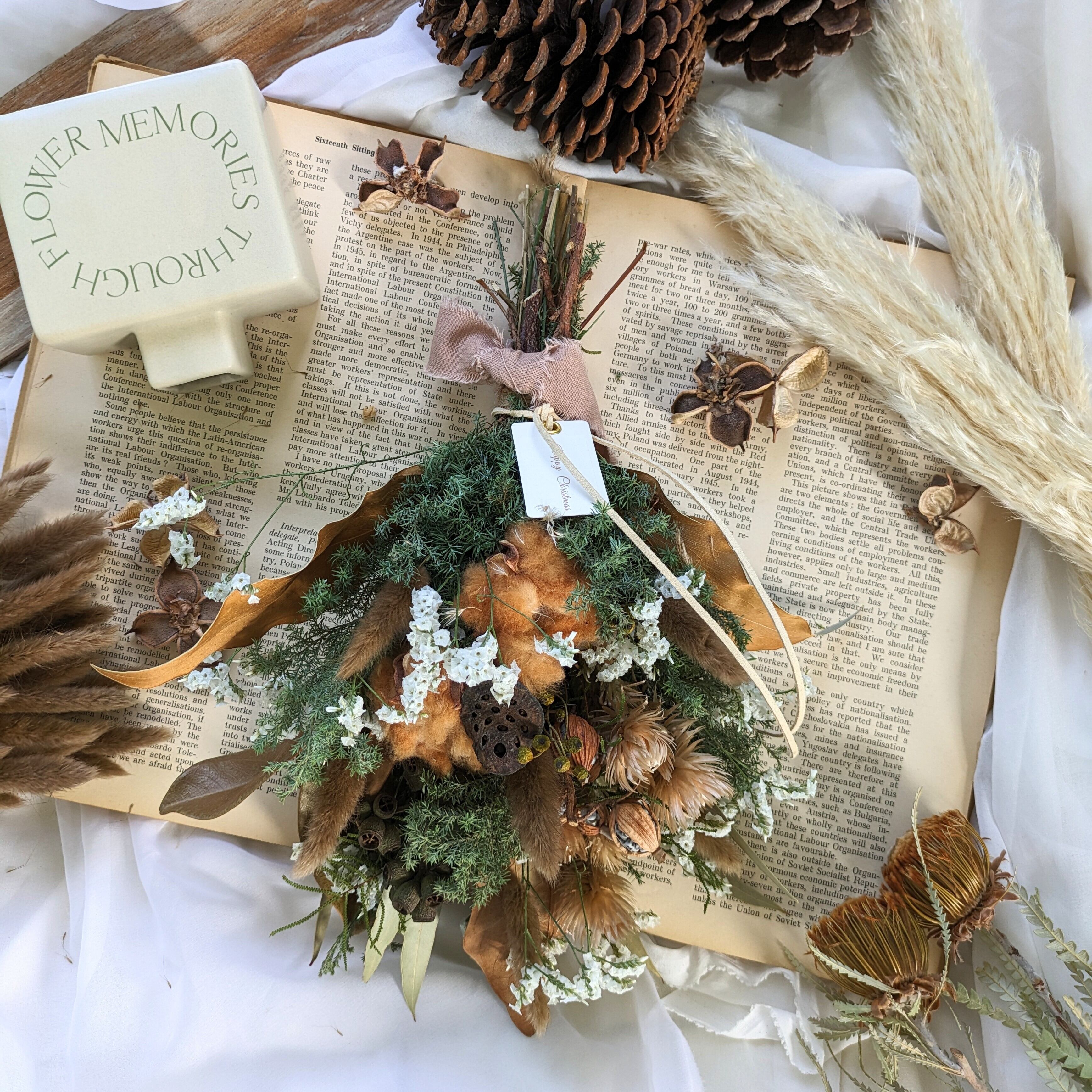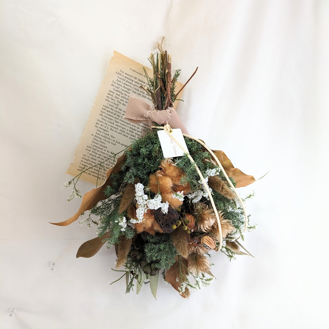 茶色のコットンフラワーやグレビレア、ゴールドヒムロスギ、月光のみなど、さまざまな素材を組み合わせたシックなデザインです。